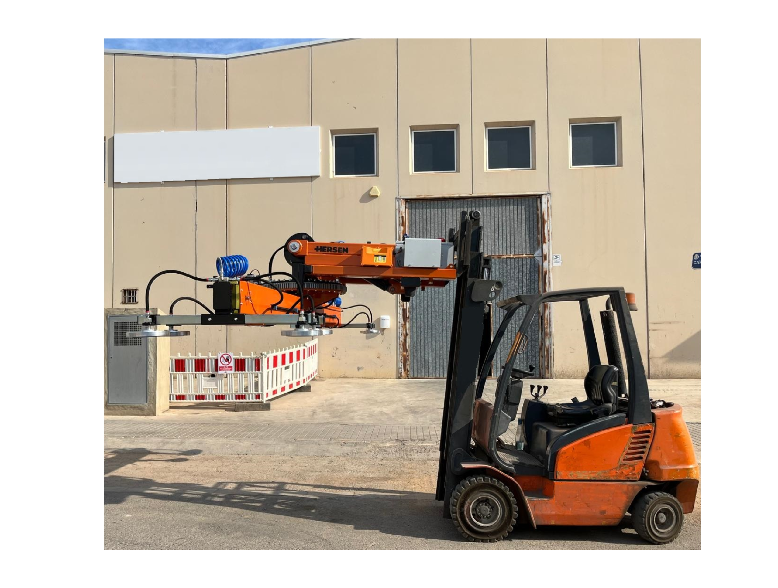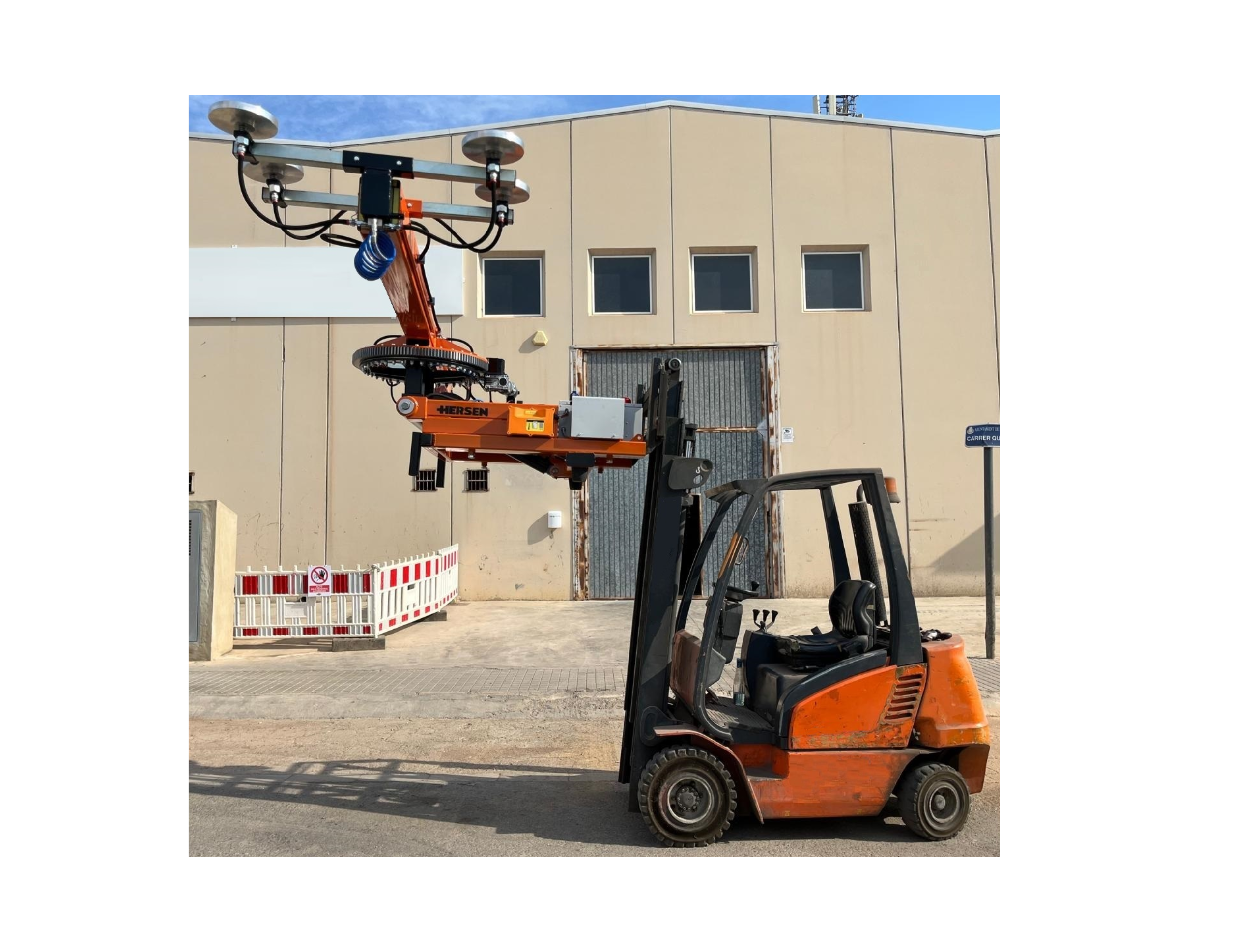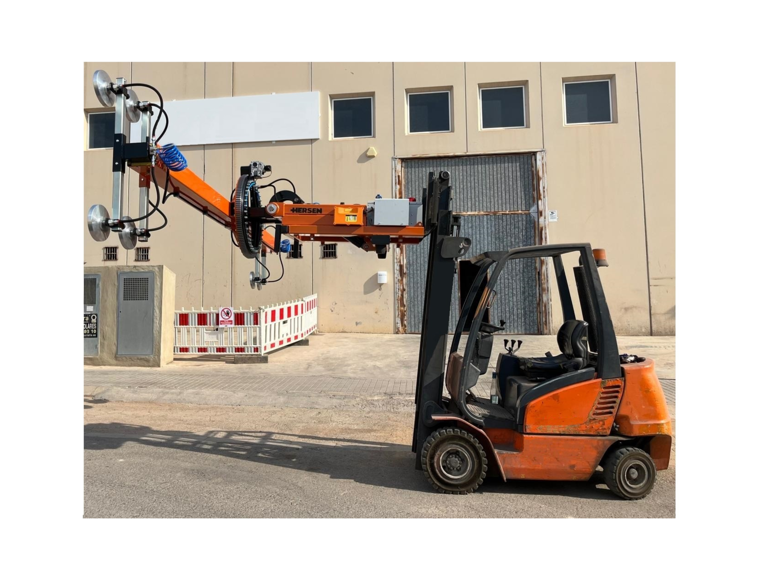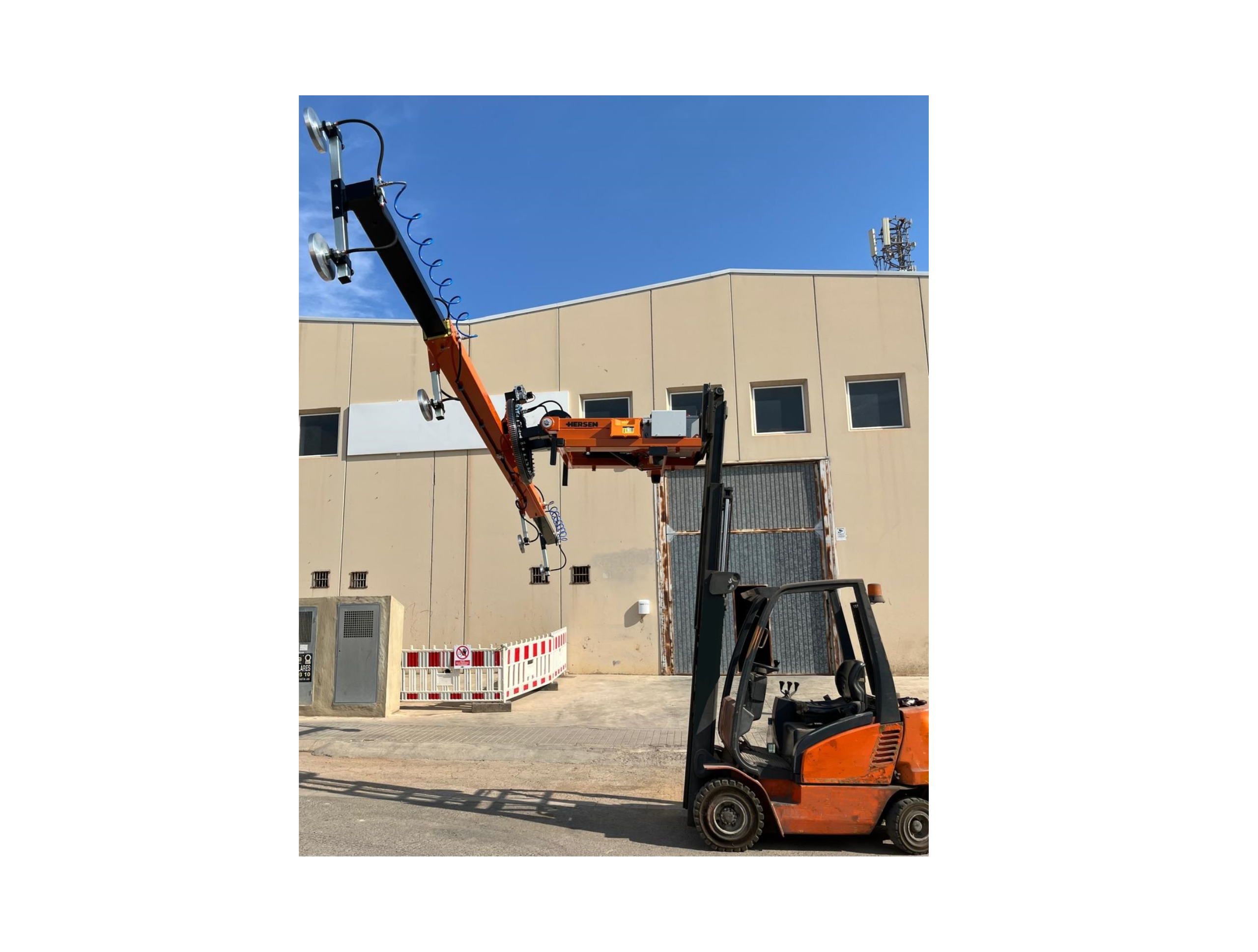 Ventosa a batería para voltear 0 a 180º y rotar 360º paneles sándwich con carretilla elevadora.